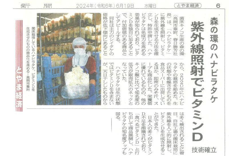 2024年6月19日(水)付の北日本新聞に「ハナビラタケ紫外線照射でビタミンD技術確立」が掲載されました。